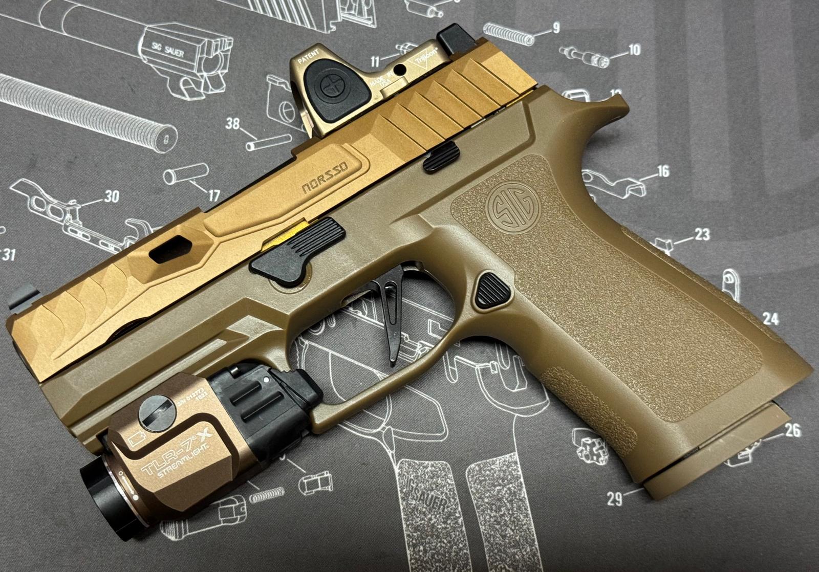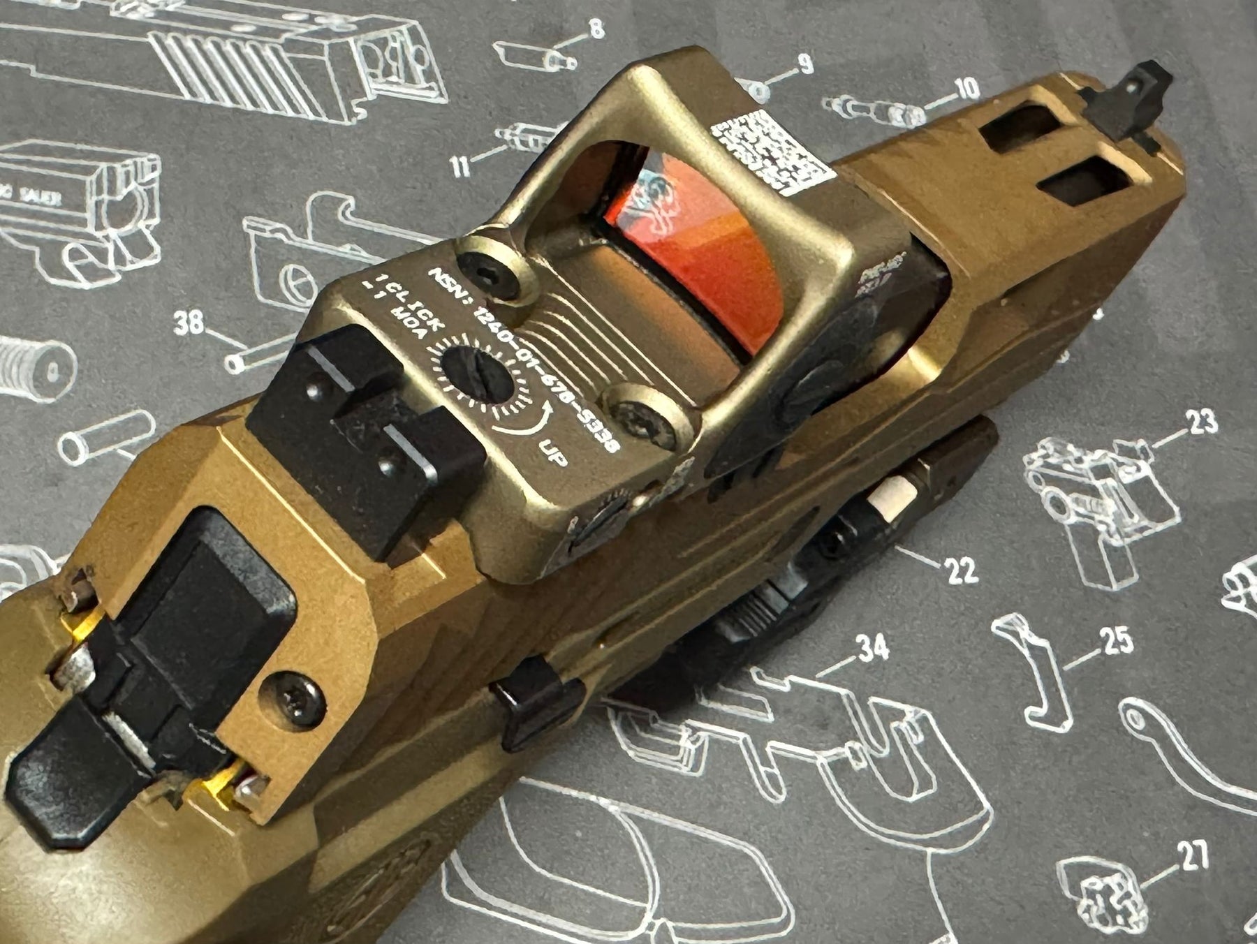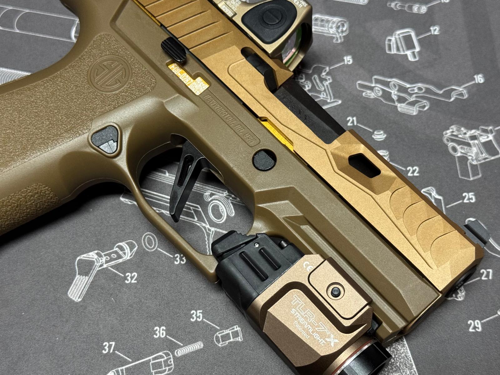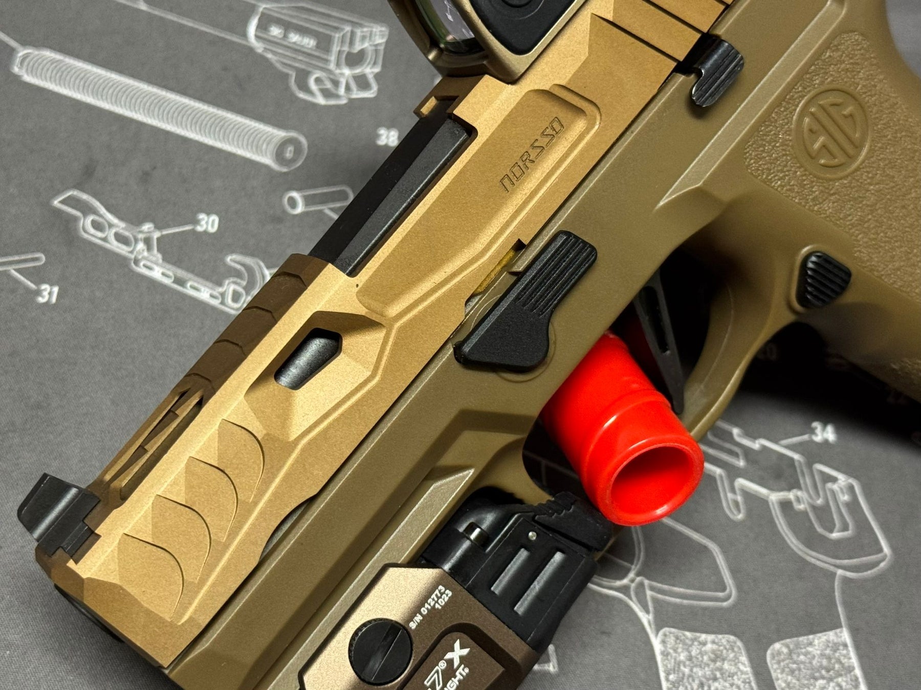 - SIG M18 GBB based - Nova CNC Aluminum Nos style ( Reptile Cut ) set Installed ** Duracoat in Tan color - CNC Steel M18 NOS type Outer barrel Installed - CNC Steel Front / Rear sight Installed - CNC Steel Take down Lever / Mag Release Installed - CNC Steel Recoil Spring Guide Rod set with 150% spring Installed - CNC Aluminum Skeletonized Flat Trigger Installed - CNC Aluminum RMR plate cover x 2 - P320 Polymer lower frame Installed - SIG 23 +1 rds Magazine - Holy Warrior RMR HRS sight x 1 - Sotac TLR-7X Flashlight x 1 - Full Marking version