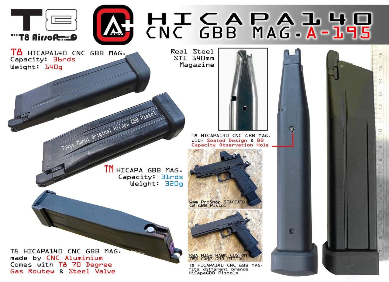 - CNC Aluminum Constructed Magazine - 140mm 36 Rounds BB Capacity - T8 70 Degree Gas Seal & Steel Valve - Enhanced Gas Efficiency & Performance - Lightweight Design- Compatible With Tokyo Marui TM Hi-Capa GBBP Series