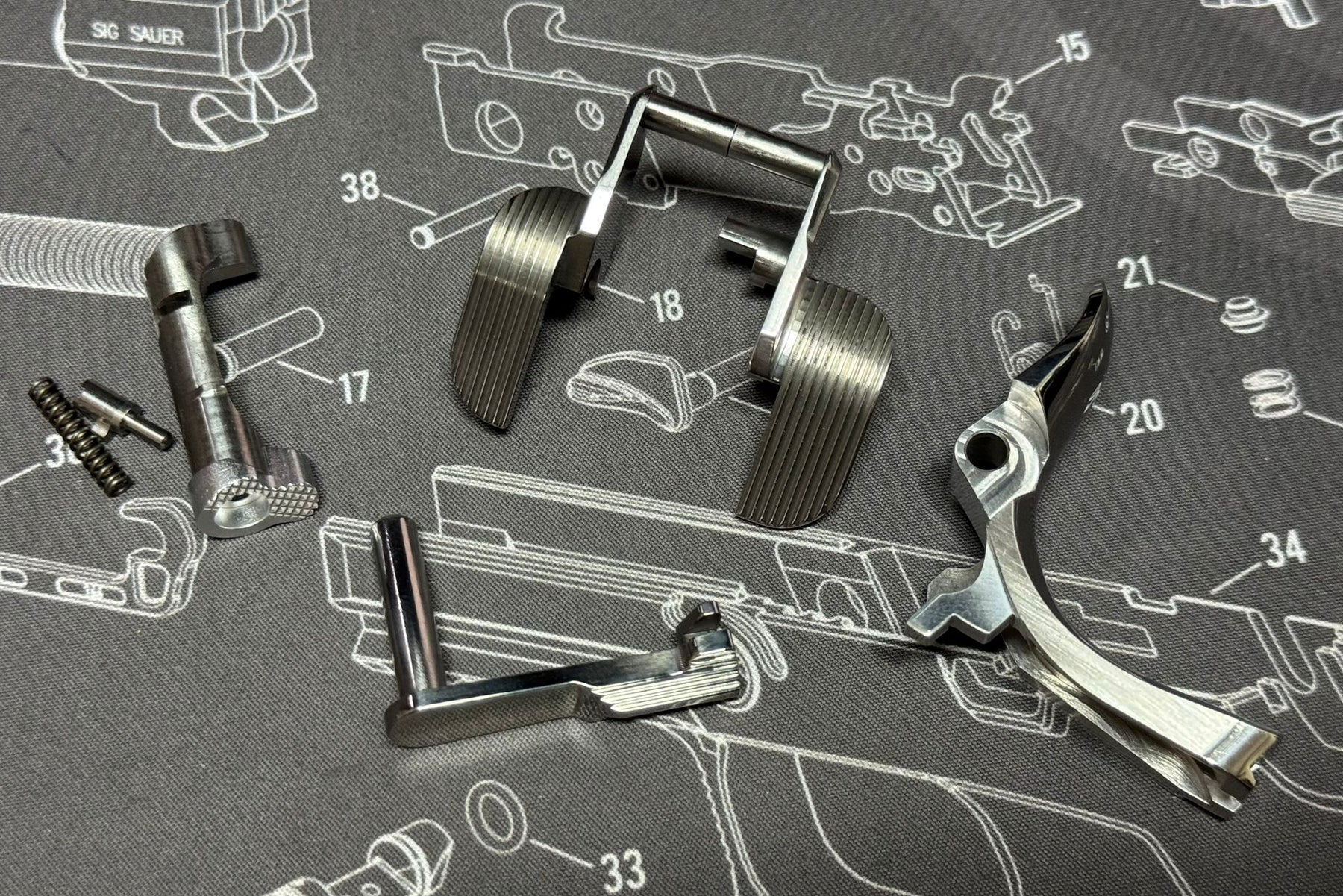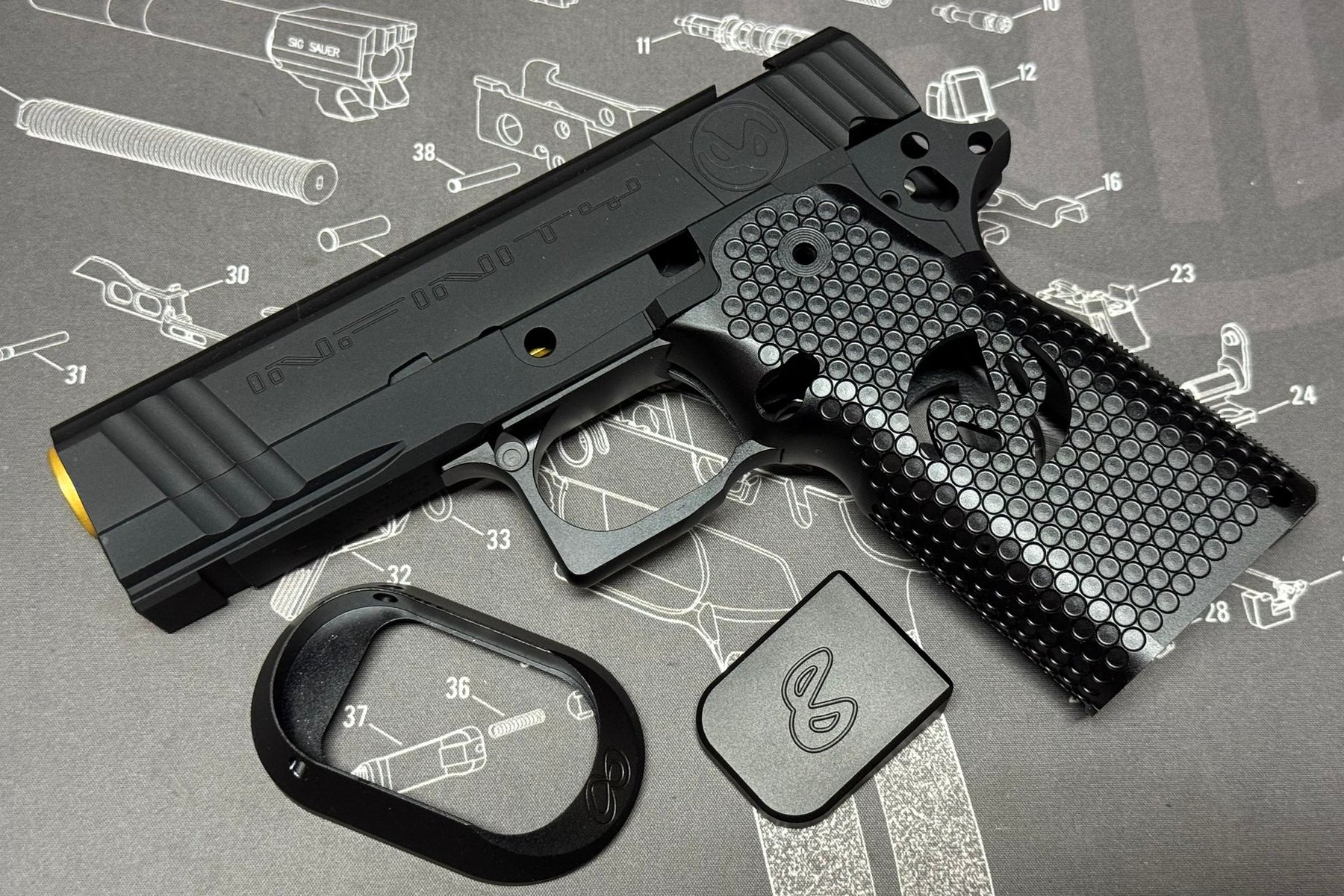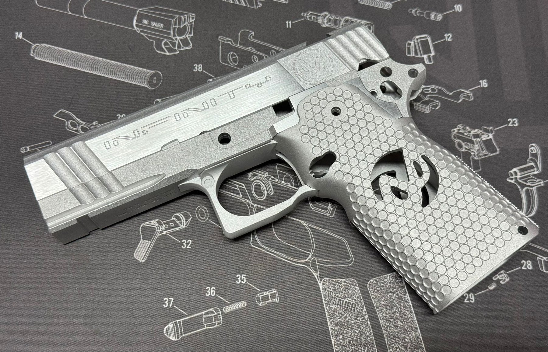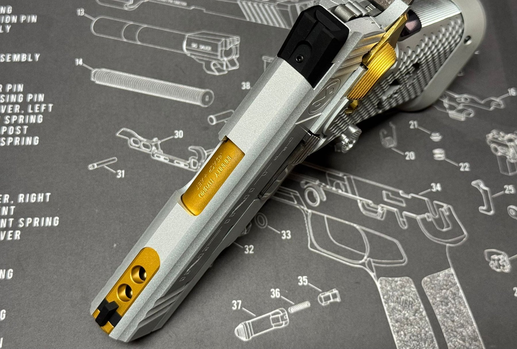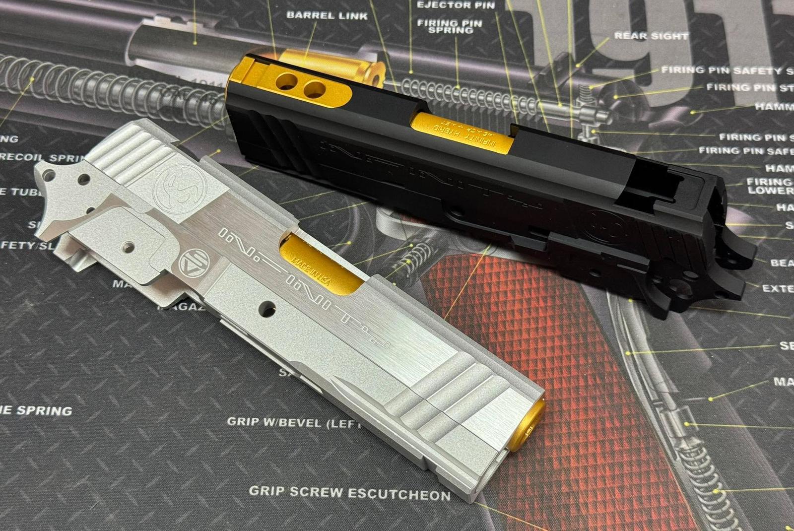 - CNC Aluminum 3.9 inch SV style Slide / Frame Set x 1 - CNC Aluminum Hybrid type outer barrel x 1 - CNC Aluminum Infinity Micro Pocket style Compact Grip x 1 - CNC Aluminum Front / Rear Sight set x 1 - CNC Steel Recoil Spring Guide Rod set x 2 - CNC Stainless Sear / fire pin set x 1 - CNC Stainless SV type Magazine catch x 1 - CNC Stainless SV type Safety x 1 - CNC Stainless SV type Slide stop x 1 - CNC Stainless SV type Hammer set x 1 - CNC Stainless SV type Grip Safety x 1 - CNC Stainless Grip screw set x 1 - CNC Aluminum Main spring housing x 1 - CNC Aluminum SV type Magwell & Magazine pad x 2 - Full Marking version