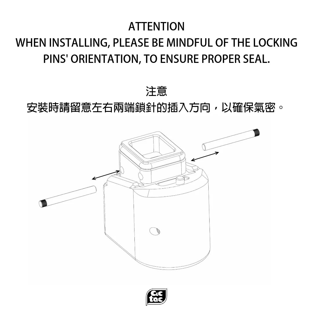Please be mindful of the locking pins' orientation during assembly to ensure a proper seal.
